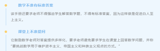 说白了,就是列出了教学中一些僵化教条,与实际脱节的东西,是否把这个标签为白人至上主义有待商榷。但是把批评,“只强调正确答案,而忽视概念和推理过程”,等同于不允许有标准答案,1+1不能只等于2,如果不是看不懂英文,就完全是恶意曲解了。至于把强调学生课堂主动性,就等同于上课不允许提问,则完全也是胡乱解释。
