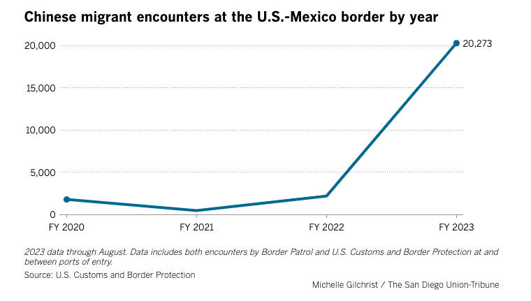 在美墨边境,边境巡逻队从1月到9月共逮捕了22187名从墨西哥非法越境的中国人,几乎是2022年同期的13倍。9月份的逮捕人数达到峰值4010人,比8月份增加了70%。其中绝大多数是单身成年人。