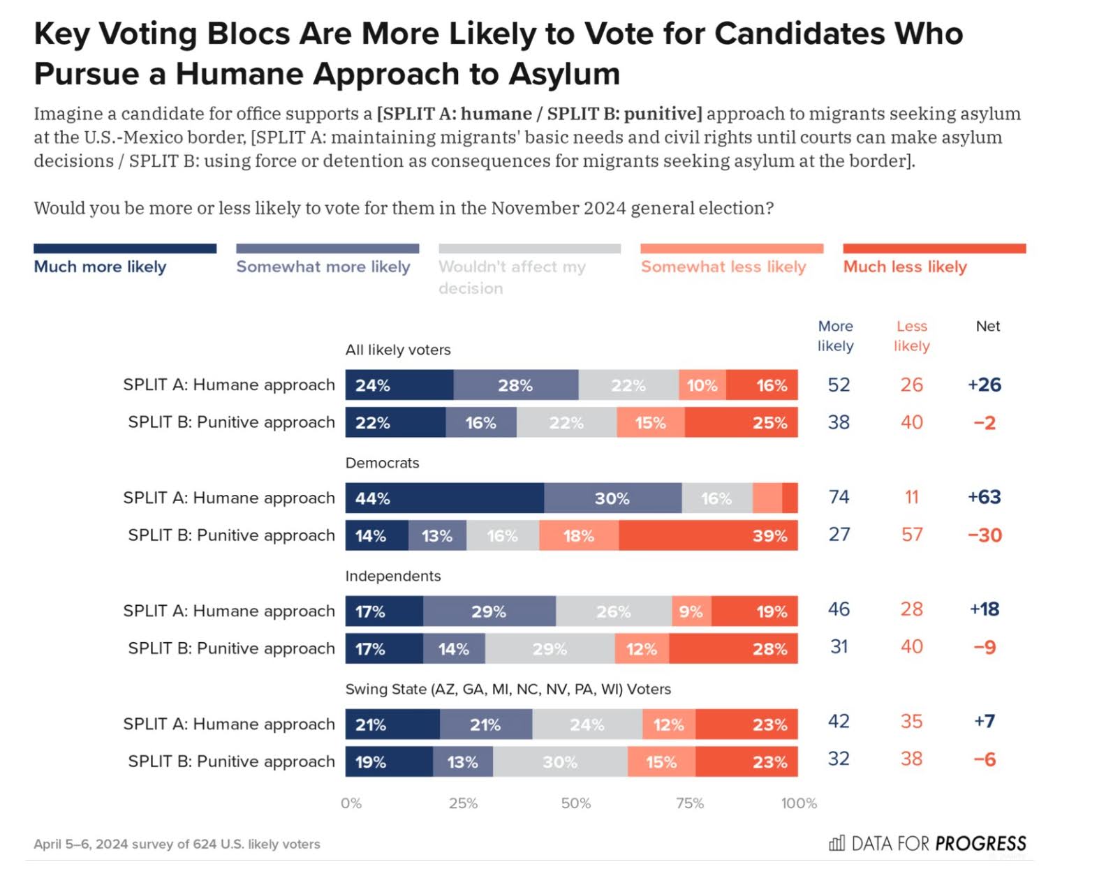 进步智库和民调公司“进步数据”(Data for Progress)的民意调查发现,如果将庇护方式设定为在人道和惩罚之间做出选择,那么绝大多数选民支持采取更温和的方式。