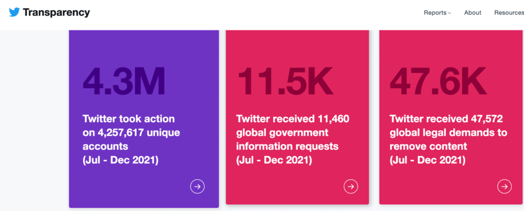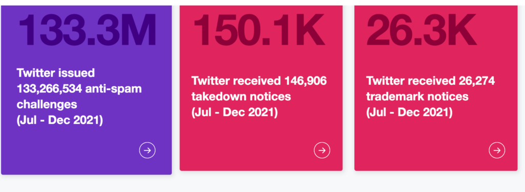 推特于2020年成立“透明度中心“(Transparency Center)公开自己处理信息的情况。下图提供了2021年7月至12月的数据 (https://transparency.twitter.com/):
