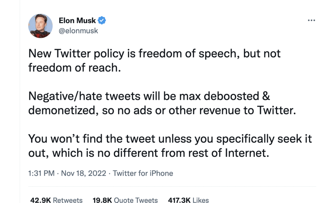 马斯克一直以推行绝对的言论自由自居。 他在四月份表示收购推特时,当时的说辞就是维护言论自由。 马斯克在2022年4月14日 TED 会议上采访时表示,他计划仅仅删除明显违反法律的内容 (比如煽动暴力),而将其他所有信息—无论有多到争议—都保留在推特上。