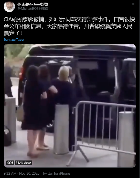 又有一则谣言说,中央情报局(CIA)的主任Gina Haspel被抓,还发了一段一名女性被人架上一辆面包车的视频。