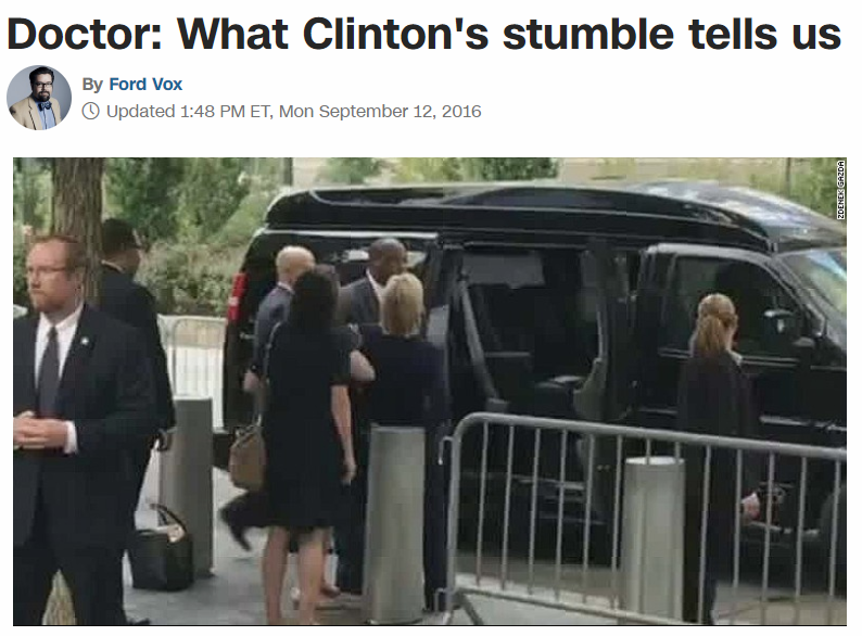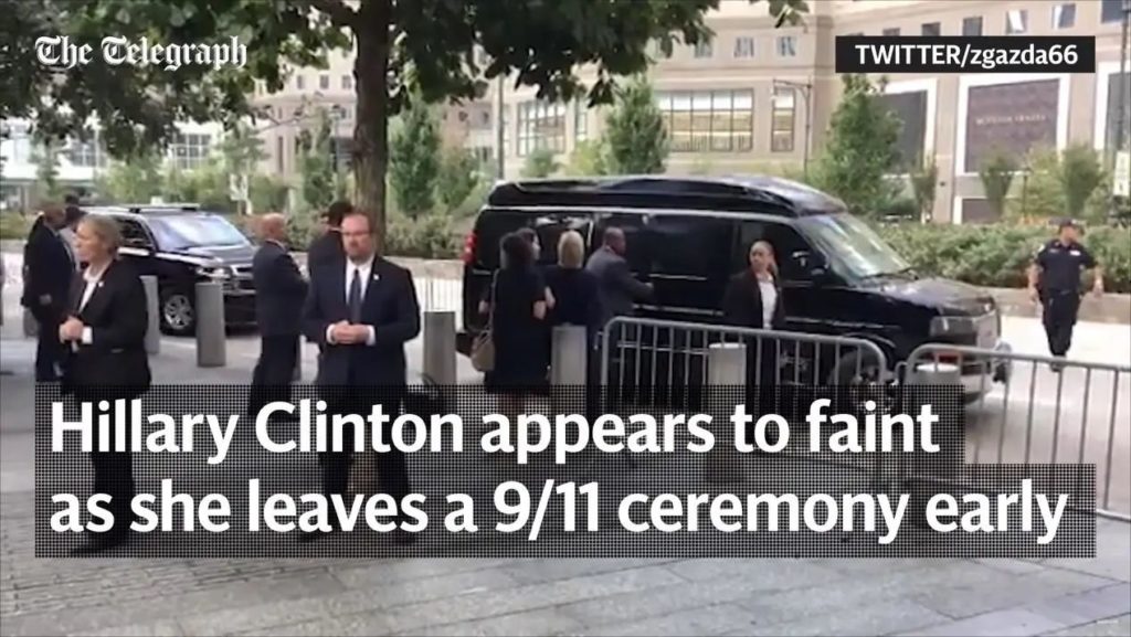 稍微有点记性的人都知道,这段视频中的女性不是什么美国中央情报局长,而是2016年竞选时的希拉里·克林顿。当时她参加完911纪念仪式,因为身体不适,在等候座驾时疑似晕倒,被人架上保姆车。她之后因为肺炎休息了几天。作为当时的总统候选人,她的身体状况,也引来了各方面的关注和担忧。