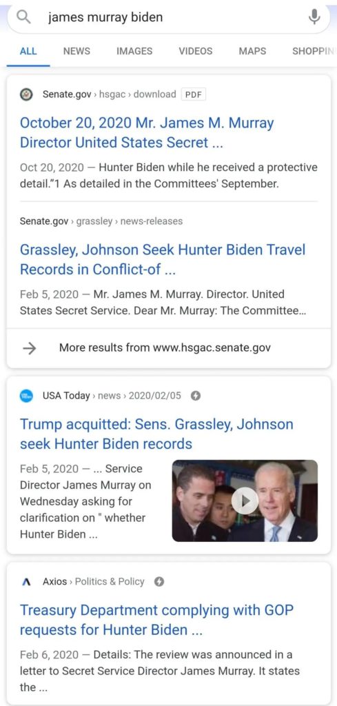 James Murray确实是特勤局的局长,但是这完全是一条中文世界自产自销的谣言,因为在谷歌上用James Murray和Biden作为关键字搜索,都搜不出任何一条相关的英文消息。而且腾讯新闻竟然参与其中,扮演了不太光彩的角色。