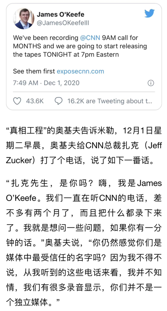 这个詹姆斯·奥基夫是美国保守派政治活动家和挑衅者。他在学术机构,政府机构和社会服务机构中秘密录制卧底音频和视频节目,目的是表明这些机构的员工或代表的侮辱性或非法行为。他有选择性地编辑视频,以歪曲谈话内容和受试者的回答,从而给人造成一种错误的印象,人们说过或是做了他们没有做过的事情。