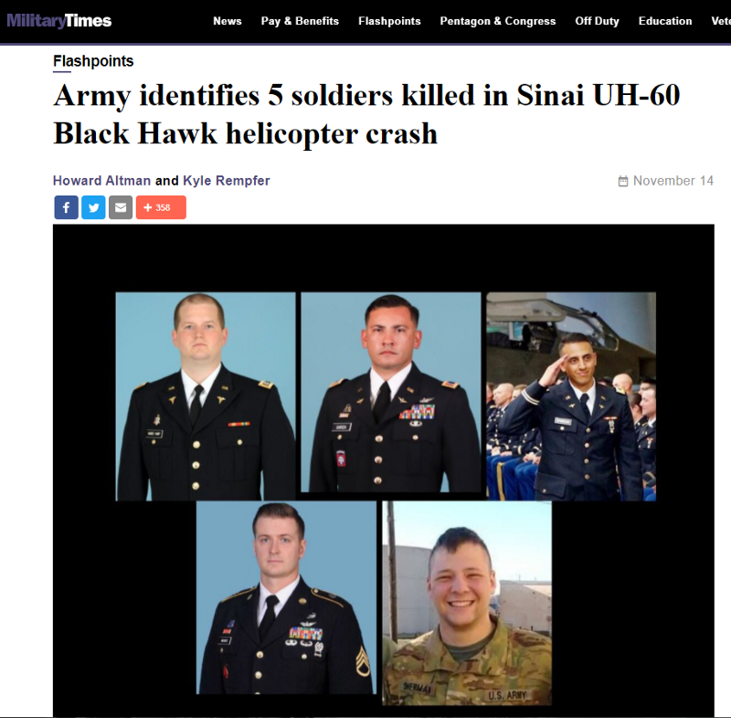 事实上,照片中这五名士兵经证实是在埃及西奈半岛黑鹰直升机坠机的牺牲者,但事故发生时间是11月12日。把12日发生的事故安排到28号出来的谣言上,是典型的移花接木手法。