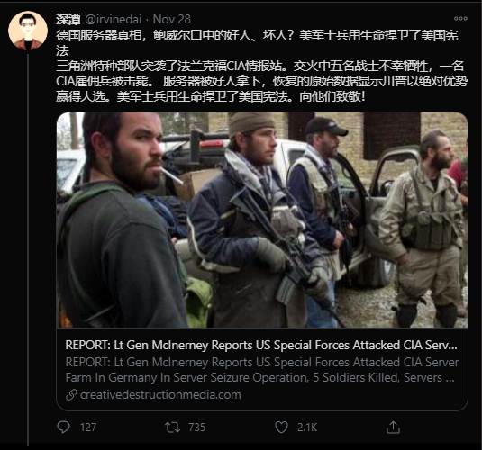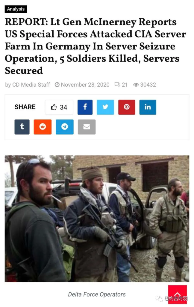 这一条就比较猛料了。日前网上流传了一篇署名“纽约及时羽”的公众号文章,叫《美国大选:浴血的服务器》(已被删)。说几天前网上流传的dominion服务器在德国法兰克福被美军截获的没人相信,现在有了新版本。新版本说这个服务器是归CIA所有,有陆军特种部队与CIA的军队(CIA还能有军队?)在法兰克福发生激烈的交火,一名CIA军官在交火中丧生,5名士兵也被打死。主流媒体为了掩盖事实真相,说CIA丧生的军官是在索马里被杀,5名士兵则是在埃及死于直升机坠毁。这种脑洞大开的好莱坞大片情节,还真有人相信。而且这条还跟前面说的CIA主任被抓的谣言联系在了一起。