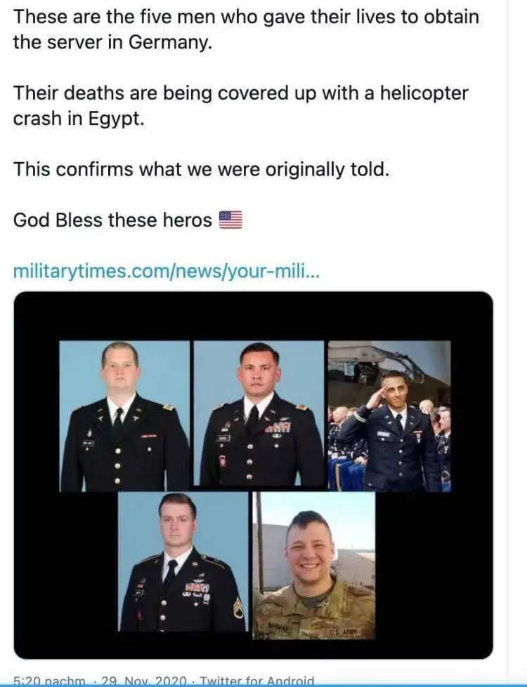 这则谣言声称被杀的五名士兵的死因被掩盖为在埃及坠机身故