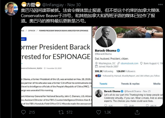 从11月30号开始,网上开始传前任总统奥巴马因为间谍罪被抓,并且其中一个依据是奥巴马的推特5天都没有更新了。