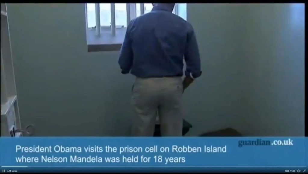 更有甚者,还有人发了一个疑似Obama在牢房里的视频。其实这段视频是2013年,奥巴马任总统期间,访问南非时参观曾经关押纳尔逊·曼德拉18年的牢房,完整视频里面说得很清楚。