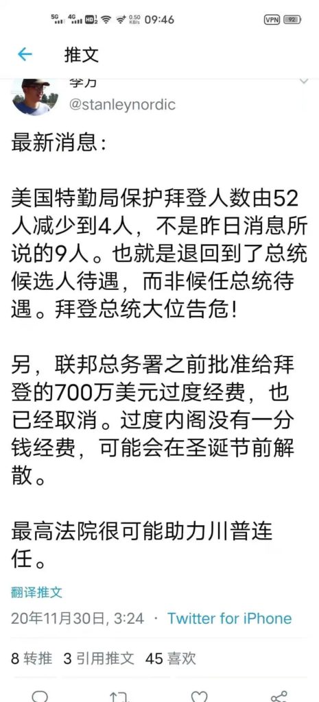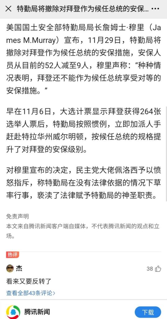 11月30号开始网上流传一条消息说国土安全局特勤局的局长Murray,削减了候任总统拜登的安保人员人数。以此来证明,拜登还不是正式的候任总统。