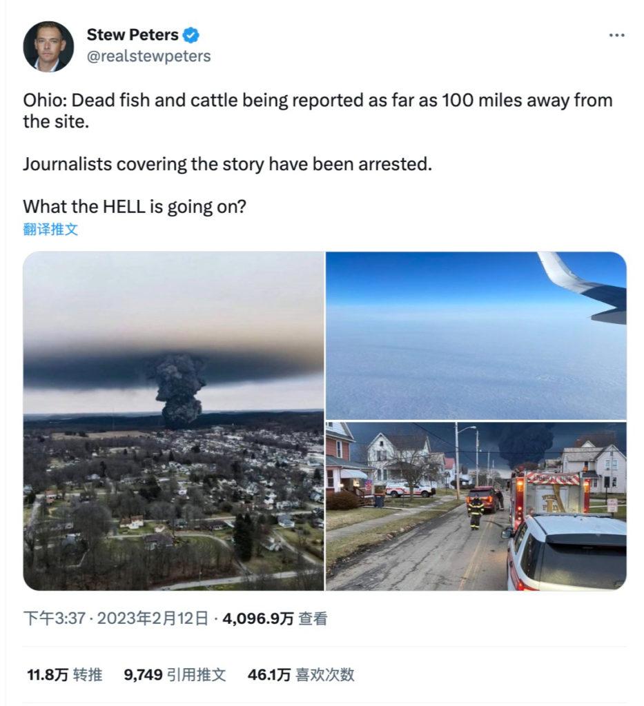 右翼评论员斯图·彼得斯(Stew Peters)在Twitter上写道,“据报道,离事发地100英里远的地方还有死鱼和死牛。”他没有提供任何证据。这条推文的浏览量超过4000万次。官员们表示,他们没有收到对野生动物造成如此广泛影响的报告。