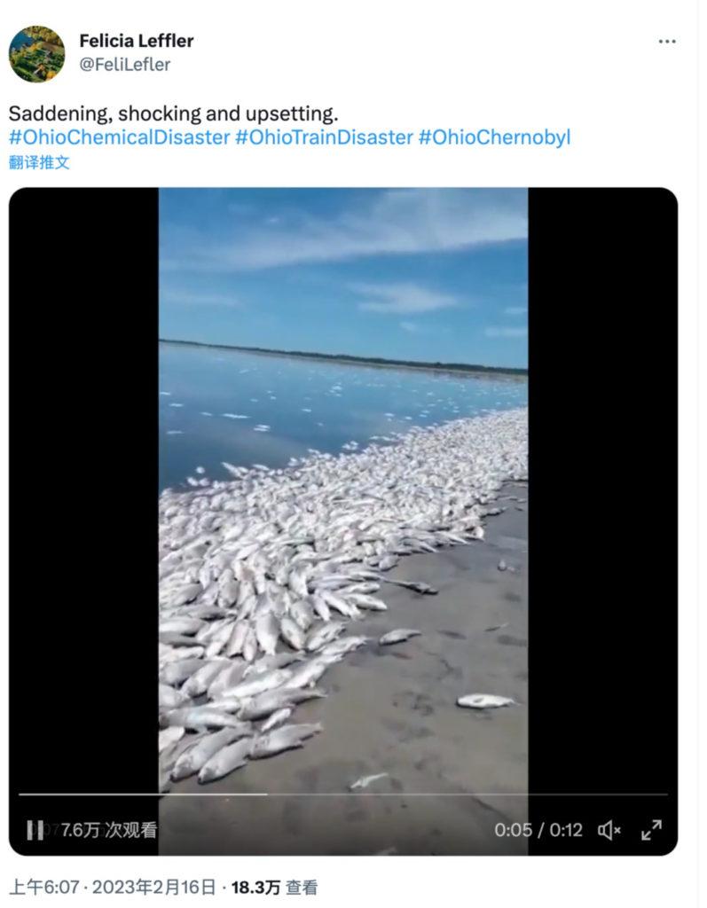 在Twitter和Telegram等社交媒体上,评论人士称目前的情况是“历史上最大的环境灾难”,或者简称为“切尔诺贝利2.0”。他们在没有证据的情况下警告称,下游各州的重要水库可能受到严重污染。他们还表示,当局、铁路公司和主流新闻媒体故意掩盖这场危机。下图显示了一个典型的例子,在打出“OhioChernobyl”标签并贴出了一段死鱼的视频后,很多评论者质疑说,视频中显示出了大量绿树,但俄亥俄州这个季节的树叶早就掉光了。此后有事实核查网站发现,这段视频实际上拍摄自阿根廷。