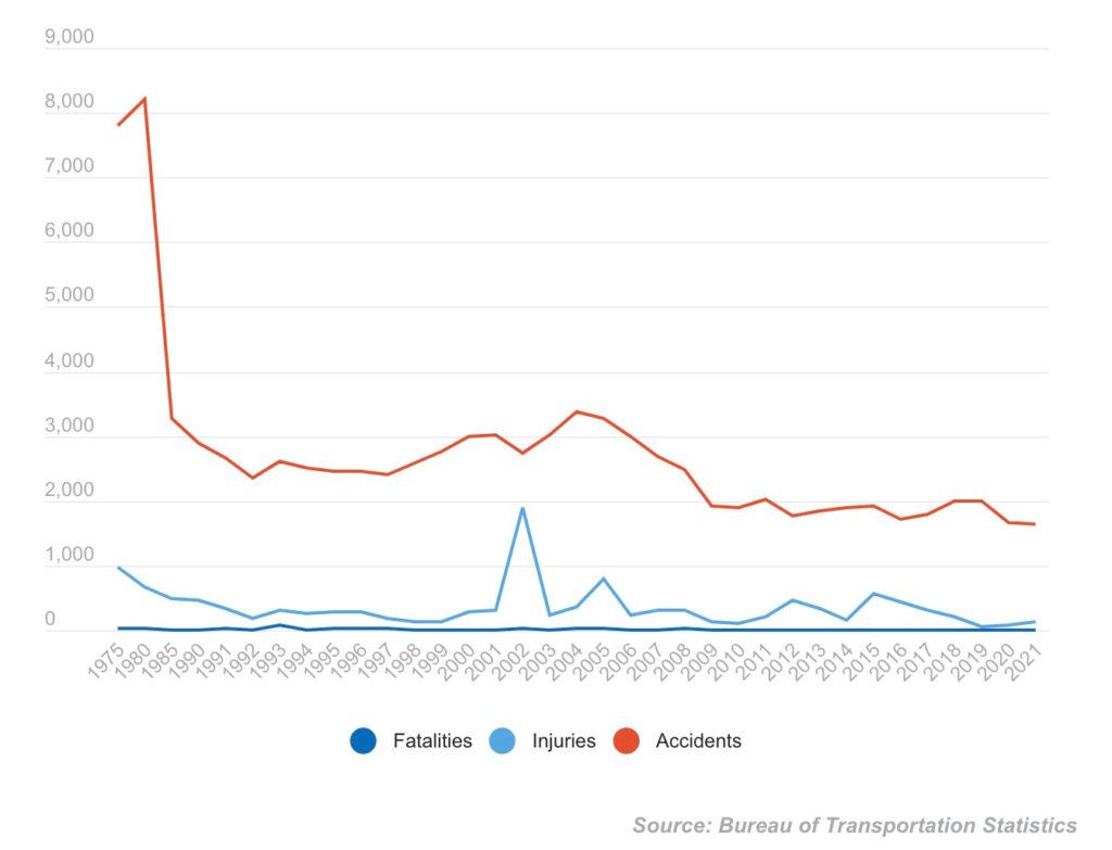 这个数字本身没有错。根据美国运输统计局和联邦铁路管理局的数据,从1990年到2021年,平均每年有1705次列车脱轨。但货运铁路行业的安全性这些年来事实上有所提高。上世纪80年代每年有3000多辆火车脱轨,但美国交通部报告称,2021年有1087辆火车脱轨,2022年是1044辆。