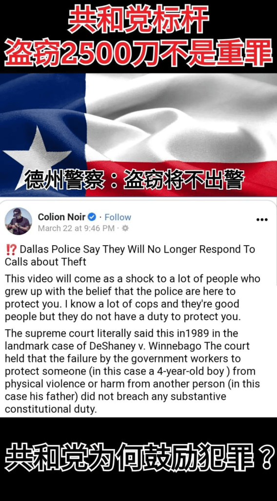在加州把 felony theft(盗窃的重罪线)从 $400 提到 $950 之后,共和党的大本营德克萨斯州,把它的重罪线从 $1500 提到了 $2500。这两个图的意思,是说共和党,或者说特朗普的支持者(其实这两个群体已经高度重合)双重标准。