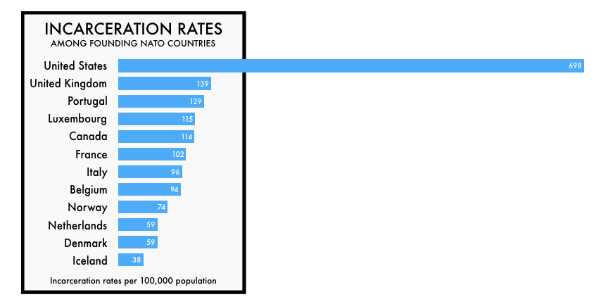 截止 2018 年,加州 10 万人监禁 581 人,少于美国平均的 698 人(排美国前三位的是俄克拉荷马 1079 人,路易斯安娜 1052 人,密西西比 1039 人)。当然,由于美国的刑罚系统在发达国家里很特殊,所以加州这个数字依然还是太高。