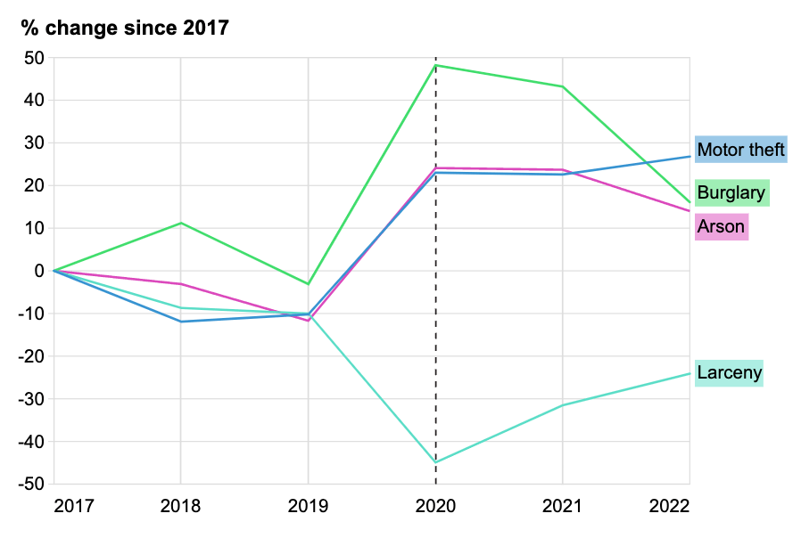 尽管入室盗窃案正在回落,但2019年至2020年增长了近50%还是比较瞩目的。盗窃案在 2020 年急剧下降后,在过去两年中又慢慢攀升至疫情前的高水平。车辆盗窃案几乎占总数的三分之二。