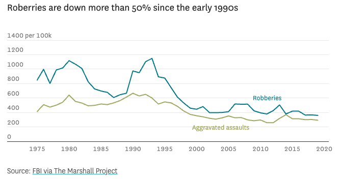 从更长的时间维度来看,旧金山的犯罪是呈现回落趋势。从七十年代至今,主要的暴力犯罪稳步下降;抢劫案比九十年代初期减少了近半。