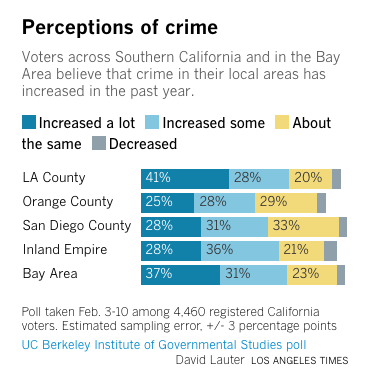 此外,近几年废除47号提案的号召很大原因与民众感知到的治安程度有关。根据《洛杉矶时报》在2022年2月做的民调结果显示,加州几个主要地区的大部人认为犯罪有一定程度的上升,总体来说大约1/3的受访者认为“上升了很多”。