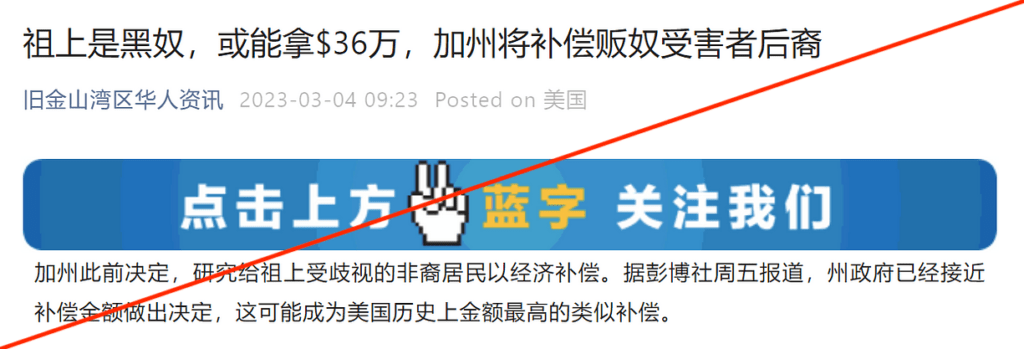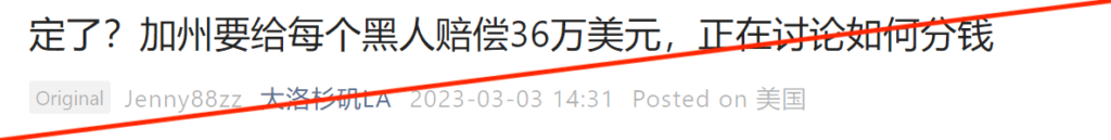 在华人互联网社区,有关于加州要赔偿非裔多少多少钱的都市传说,一直都有不同版本的叙事在网上流传。其潜台词就是,加州“白左”政府拿着纳税人的钱去补贴“好吃懒做的黑人”。