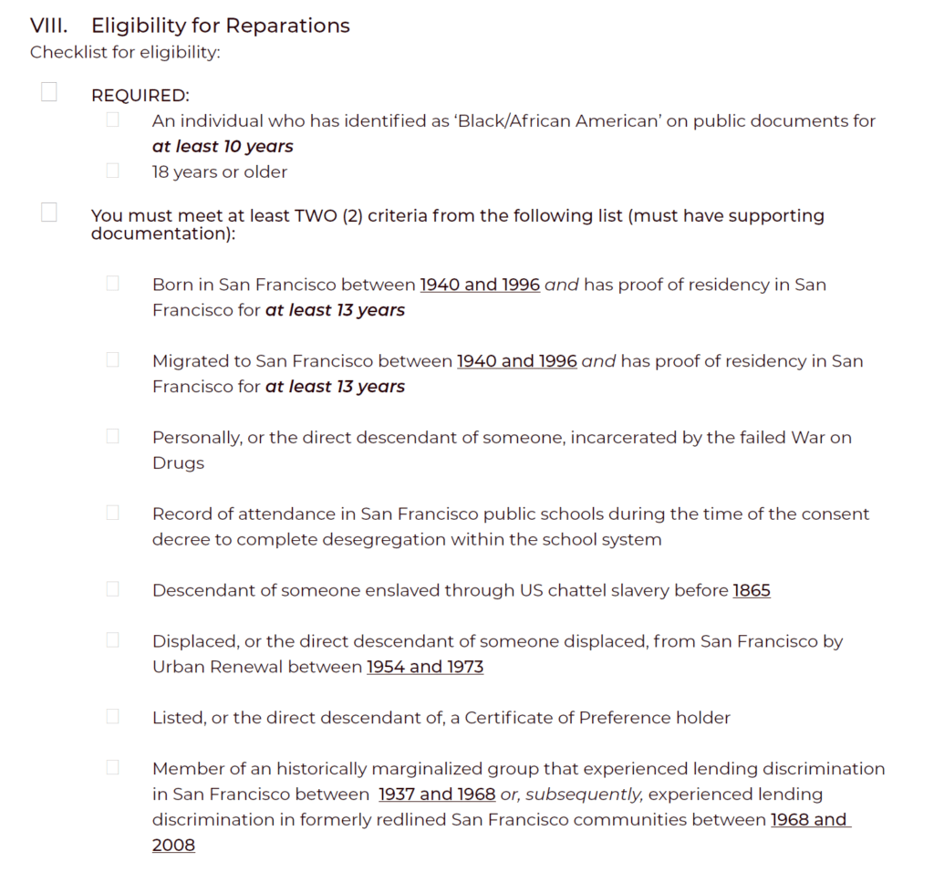 根据旧金山的建议草案,一个人必须至少年满18岁,并在公共文件中确认为非裔至少10年。符合条件的人还必须满足其他八个标准中的两个,尽管这个标准的列表可能还会改变。
