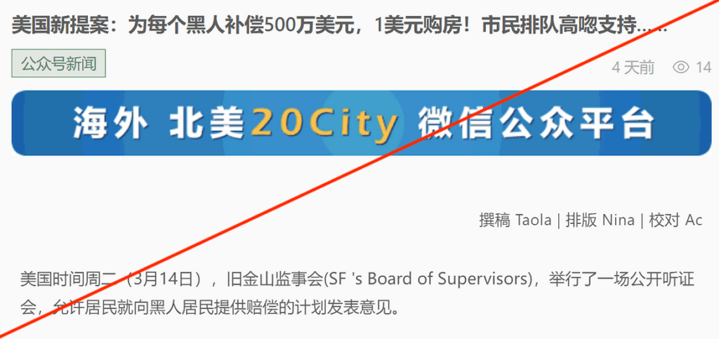 现如今这个叙事又有了新的版本。湾区华人资讯3月14日发表了一篇题为《旧金山赔偿非裔最新方案:每个黑人500万,非黑人每人掏60万》的文章,进一步挑动华人的情绪。之前网上传赔偿35万这些人都义愤填膺了,这500万的天价,还不把这些右右吓尿了。肯定又要高呼搬离加州了。