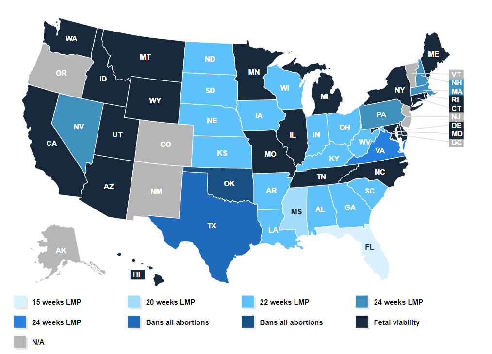 实际的情况是,大多数的州在胎儿可以在体外存活(fetal viability)之后就不允许堕胎了(见下图)。