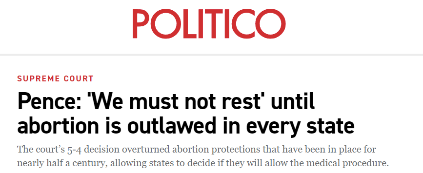 要禁止堕胎的保守派,绝不只是满足于把决定堕胎的权力还给各个州来决定。他们受罗伊诉韦德案被推翻的鼓舞,一些原教旨主义者的目的就是要在联邦层面全面禁止堕胎。例如前副总统彭斯就有此种言论,我们不能停歇,直到堕胎在每个州都非法。他们这是把个人的宗教信仰强加于全体美国人头上,这也违反了宪法第一修正案。