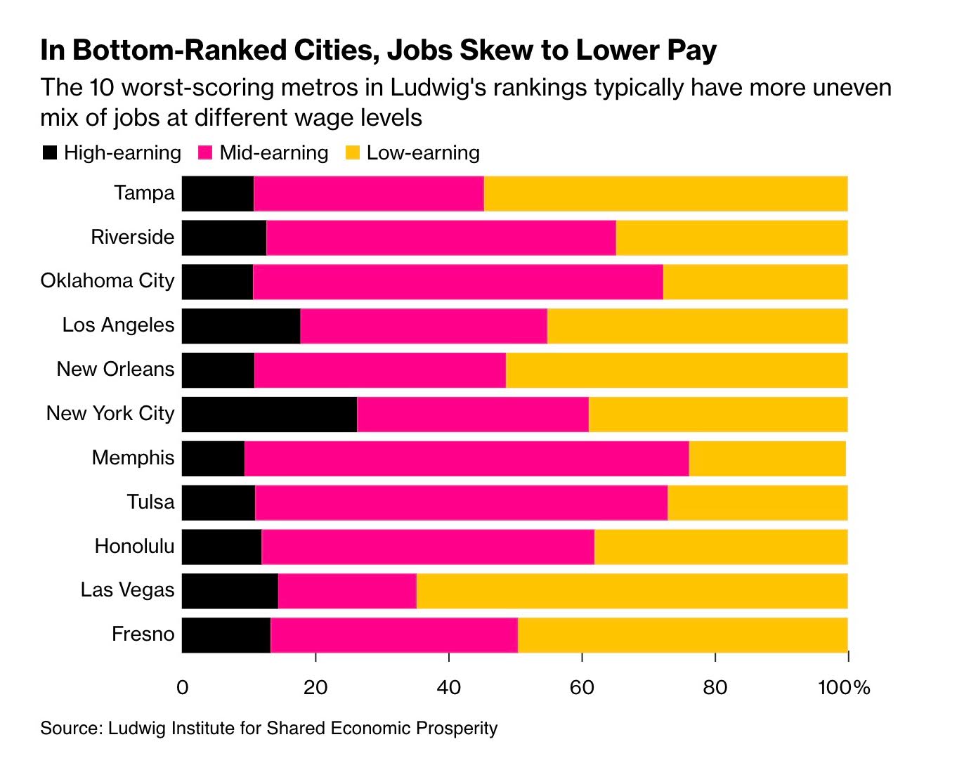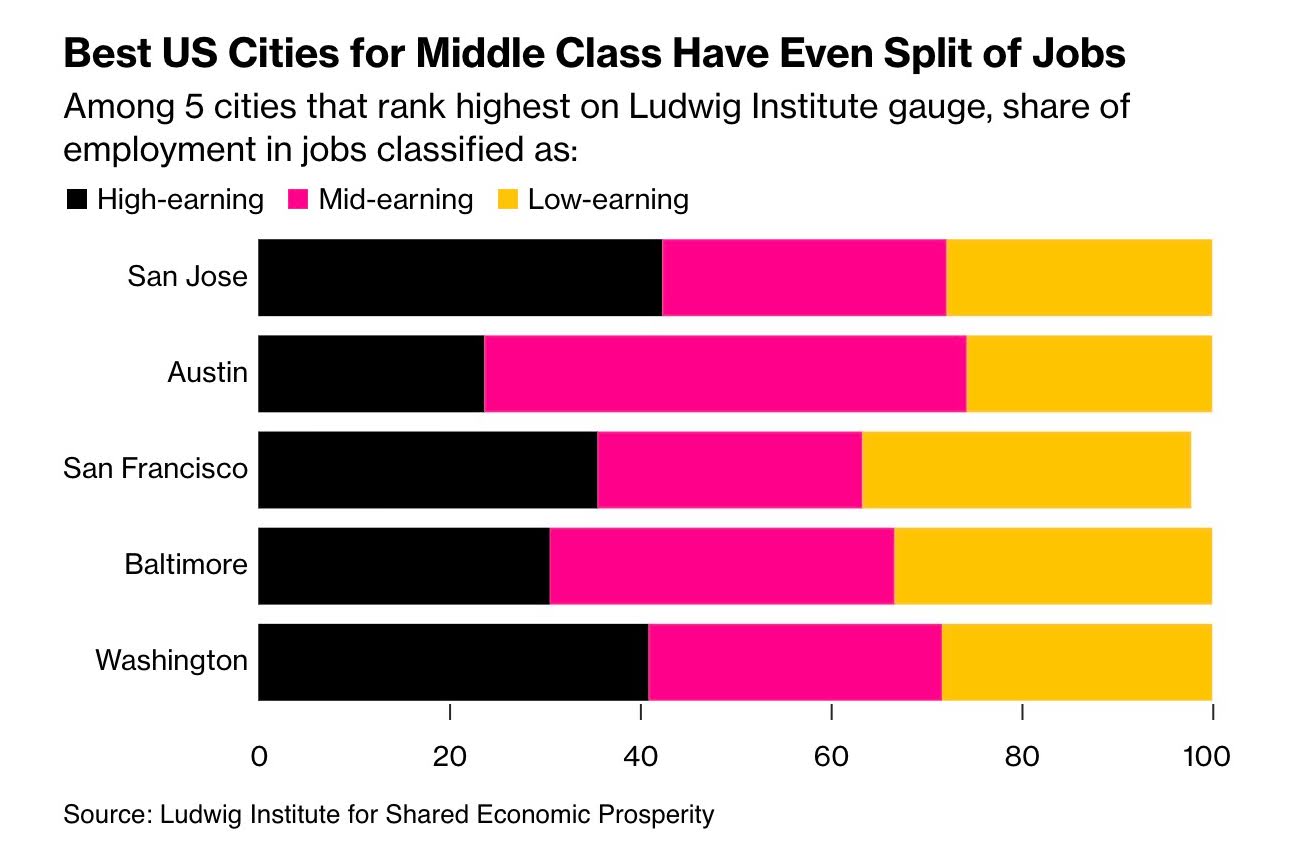 相比之下,那些家庭收入中位数中下的城市,就业机会则更为稀少。根据这些标准,落在底部的是那些低收入工薪阶层占比更多的区域——他们的收入无法抵销上涨的生活水准。