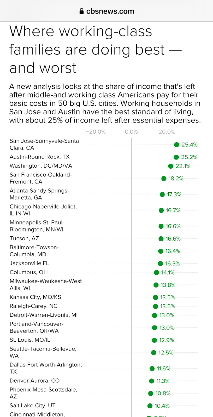 上文所说的研究来自路德维希经济繁荣研究所(Ludwig Institute for Shared Economic Prosperity,LISEP),该研究所的研究包括为失业、收入和生活成本创建更有意义的经济指标。他们的最新经济分析发现,跟一些人通常的看法相反,在美国一些最昂贵的城市,比如旧金山和圣何塞,中产阶级和工薪阶层家庭的生活水平也最好。