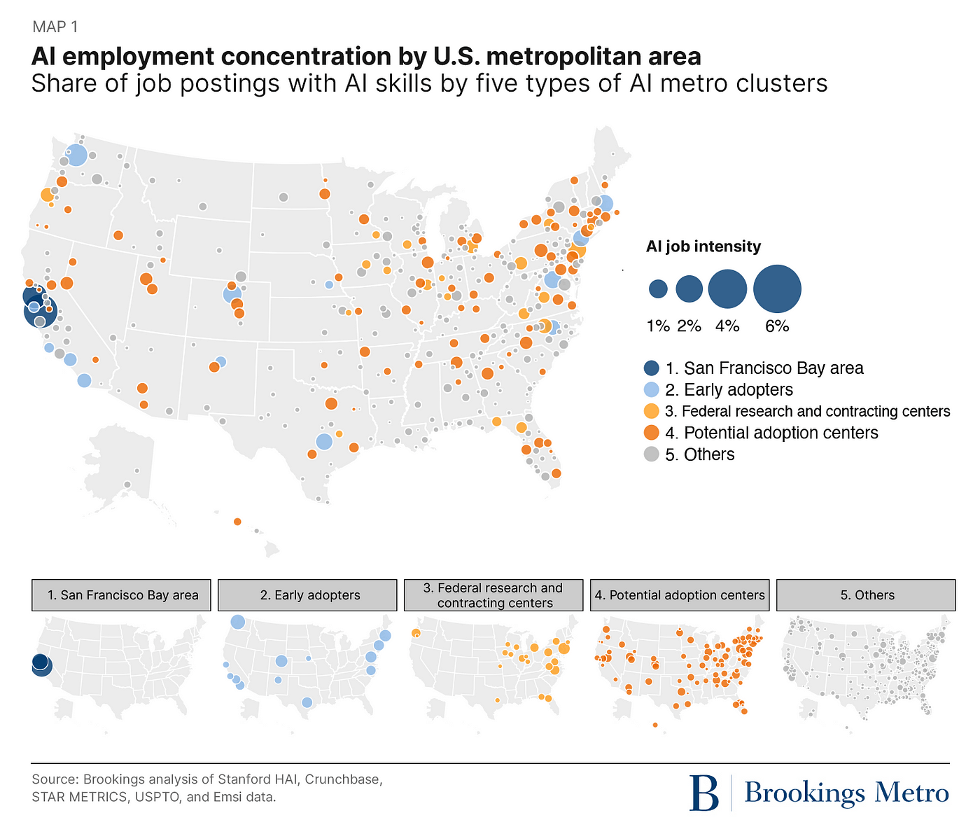 从广义上讲,人工智能是新兴技术发展经常出现的地域不均衡的缩影。布鲁金斯通过对384个都会区涵盖人工智能研究和商业化七项指标的都会区数据进行聚类分析,发现美国的人工智能活动高度集中在少数几个 “超级明星 “中心和 “早期采用者 “中心。