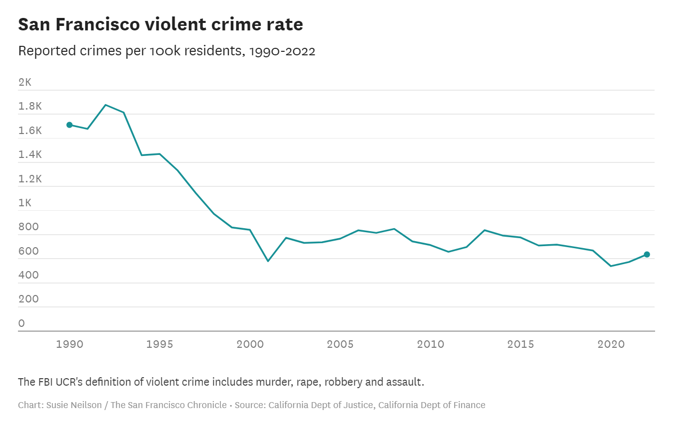 根据警方编制的犯罪统计数据,与2006年相比,如今一个典型的旧金山人成为暴力犯罪受害者的可能性更小。2022年的暴力犯罪率为每10万居民636起,比2006年下降了约25%。据统计,旧金山比休斯顿、达拉斯、西雅图、新奥尔良以及盖洛普民意调查受访者认为更安全的许多其他城市更安全。