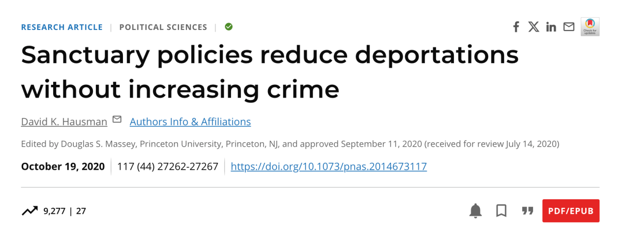 美国国家科学院2020年发表的研究发现,庇护政策并不能阻止“有暴力犯罪前科的人被驱逐出境”。这项研究分析了联邦调查局(FBI)的犯罪数据和移民与ICE的递解出境数据,发现在2010年至2015年期间,这些政策改变了递解出境人员的构成,将没有刑事犯罪记录的人员递解出境的数量减少了一半,而有暴力犯罪前科的人被递解出境的数量并未减少。实施庇护政策并没有影响实施此类政策的辖区内的犯罪率。结果表明,庇护政策可以有效减少递解出境人数,但不会威胁到公共安全。