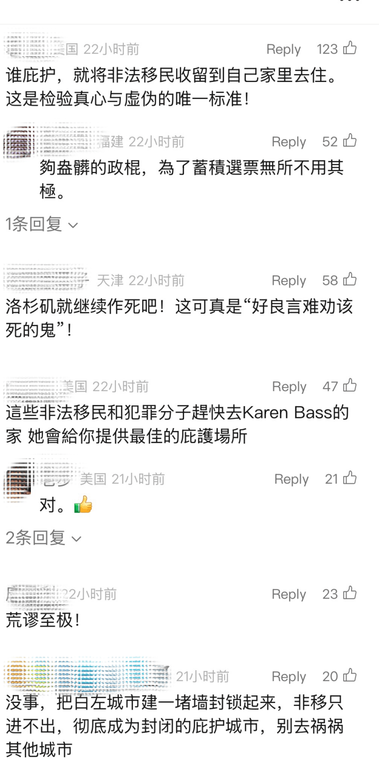 这些报道一出,立刻引起了反移民人士的批评,有微信公号在标题中直指洛杉矶是在“袒护”非法移民,评论区的画风是下图这样的。