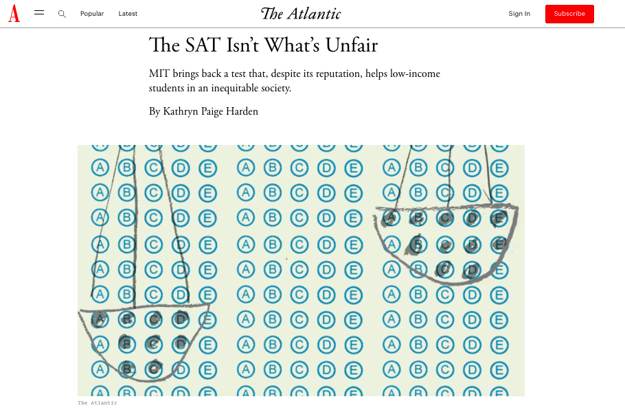 麻省理工学院的结论似乎违反直觉,因为平均而言,来自较富裕家庭的学生在SAT和其他标化考试中的成绩高于来自较贫困家庭的学生。家庭背景和SAT成绩之间的相关性在0.25到0.40之间——这是有意义的,但远非完美。尽管如此,这一结论仍然足以让一些研究人员将标准化测试视为仅仅是询问“你家有钱吗?”(ACT测试的技能与更广泛使用的SAT测试大致相同,支持和反对这两种测试的论据也类似。)