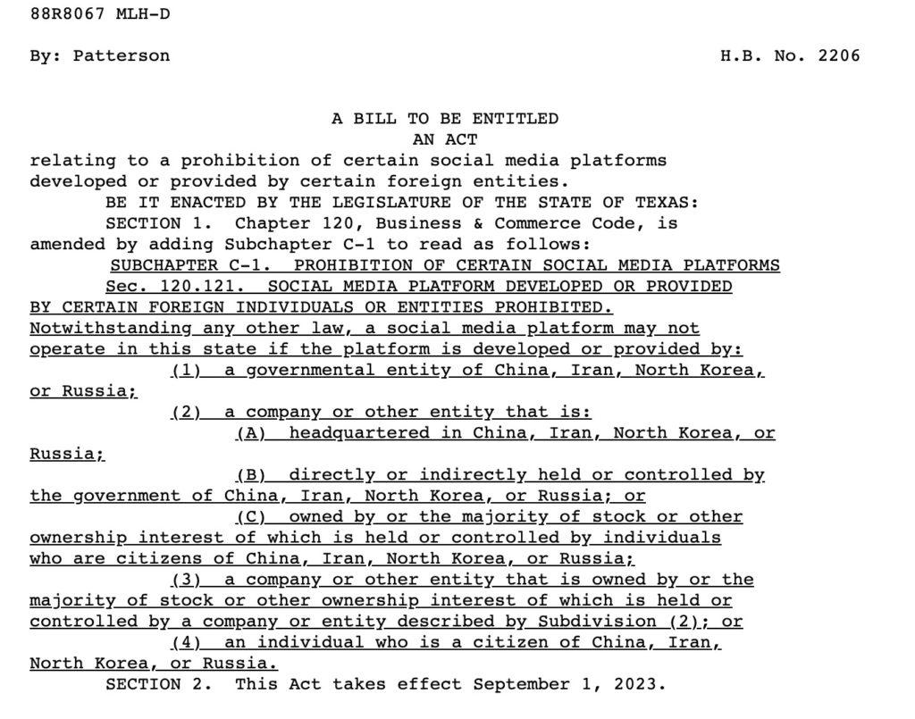 HB 2206提案是一个极度简单而又宽泛的提案,它提出要禁止某些外国实体开发或提供的社交媒体平台在德州运营。