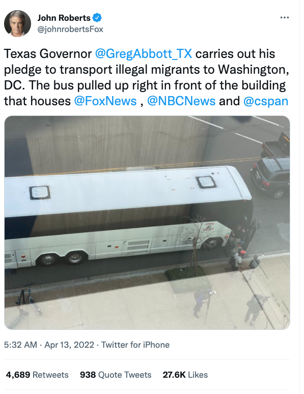 上周,德州州长阿博特(Abbott)曾放话要把边境移民送到华盛顿国会大厦。昨天(4月13日)上午,第一辆从德州出发的大巴抵达华盛顿。多家媒体集中拍摄。微信公众号“大洛杉矶LA”对此问题格外关心,连发两篇文章“赞许”德州州长的行为。