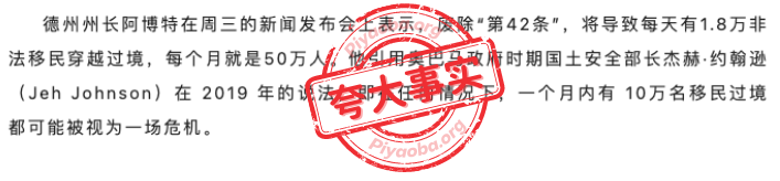 在公众号中出现的数据也存在疑点,我们在前文中提到过,根据国土安全部所做出的应急计划估算:废除第42条,每天从现有的约8000名移民增加1.8万边境移民是最坏的情况,而之前Axios报道过,目前国土安全部预估的等待国境的移民数量总共约17万。公众号中根据每天1.8万的最坏数据乘以天数得出每个月将涌入50万边境移民,属于夸大事实。