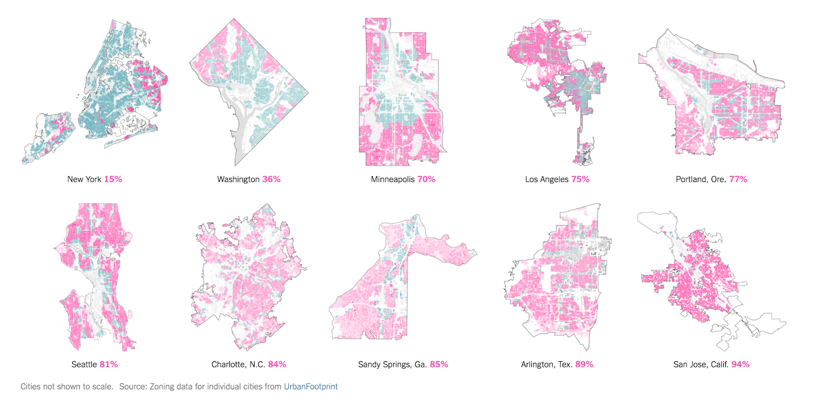 上图来自《纽约时报》曾做过的一篇深度报道,探讨的就是美国各大城市的分区法限制了修建更多可负担住宅的可能性。在这些主要城市的平面图上,红色的范围表示这些区域只能建设独栋住宅,这就导致了很多面临无家可归危机的城市,缺少可用的土地来修建更多房屋。加州的微型住宅社区选址困难,一定程度上也是受到这些分区法和土地规划规定的影响。