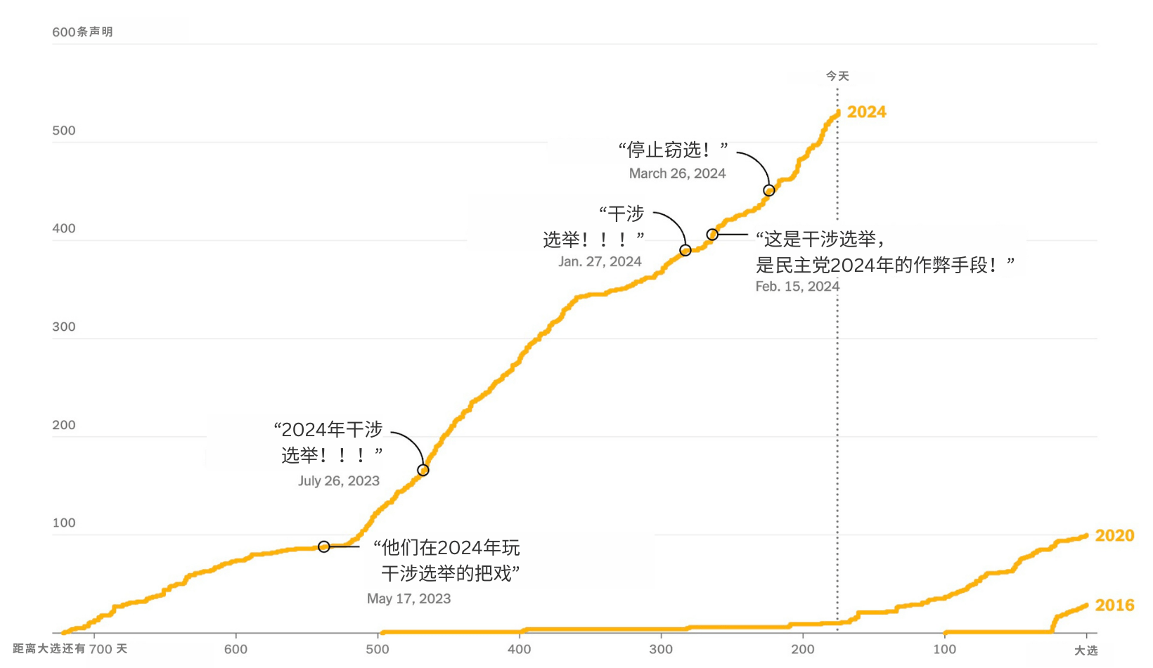 《纽约时报》记录了2024年选举周期内500多场竞选活动、社交媒体帖子和采访,在这些活动、帖子和采访中,川普诬蔑民主党人或其他人试图“操纵”、“欺骗”、“窃取”或以其他方式“影响”下届选举——或在2020年已经这样做了。