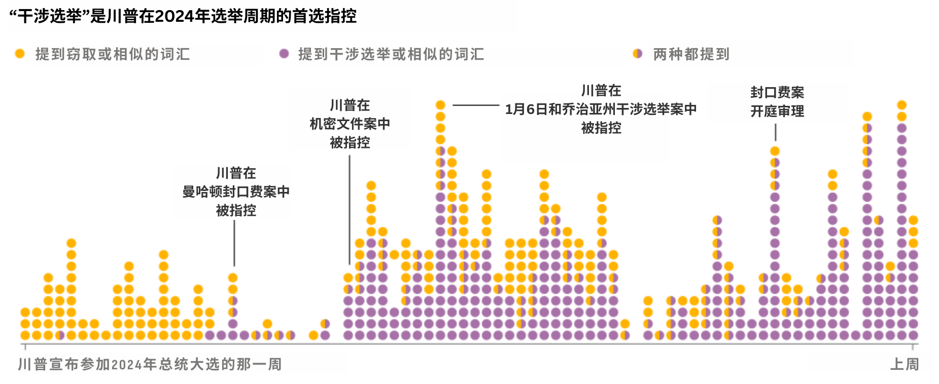 早在宣布参选之前,川普及其支持者就一直谎称拜登总统正在将司法部“武器化”以针对他。但直到去年3月,川普才确定了一项新的指控:与川普的商业和政治活动有关的多重法律挑战构成了一种“新的作弊方式”,目的是“干涉”2024年大选。他已经提出了350多次不同版本的指控。