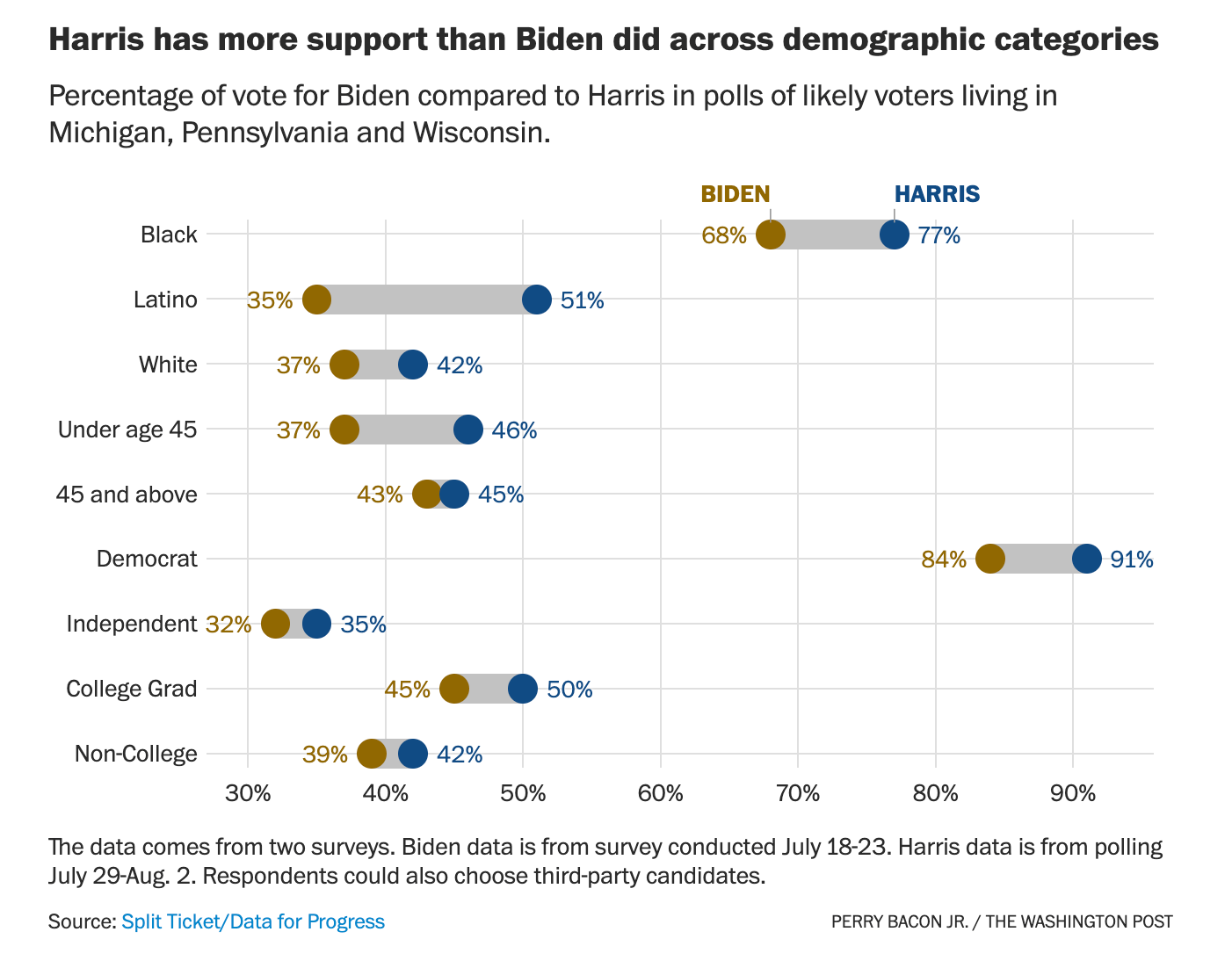 贺锦丽的优势来自不同的人口统计数据。 根据Split Ticket和Data for Progress最近对密歇根州、宾夕法尼亚州和威斯康星州居民进行的调查,她在黑人、拉丁裔和白人选民、45岁以下和45岁以上选民、民主党人和无党派人士中的表现好于拜登。