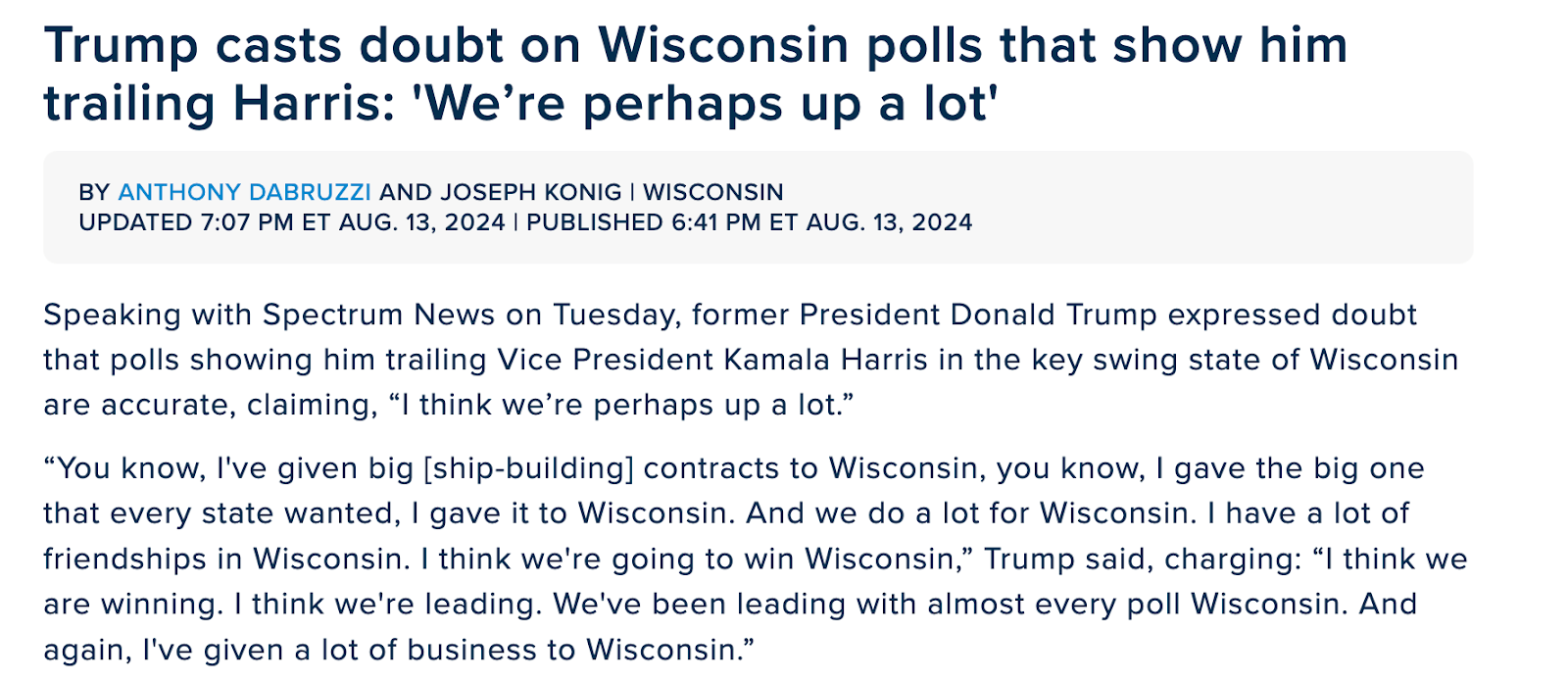 而在本周,更多民调结果显示,竞争仍然非常激烈,但贺锦丽获胜的几率已经明显高于拜登宣布退选前的情况。在轨迹突然逆转的过程中,川普越来越多地对选举的公正性表示怀疑。比如8月13日在接受《光谱新闻》(Spectrum News)采访时,他对于自己在威斯康星落后于贺锦丽表示怀疑,他说:“我认为我们或许领先很多。”