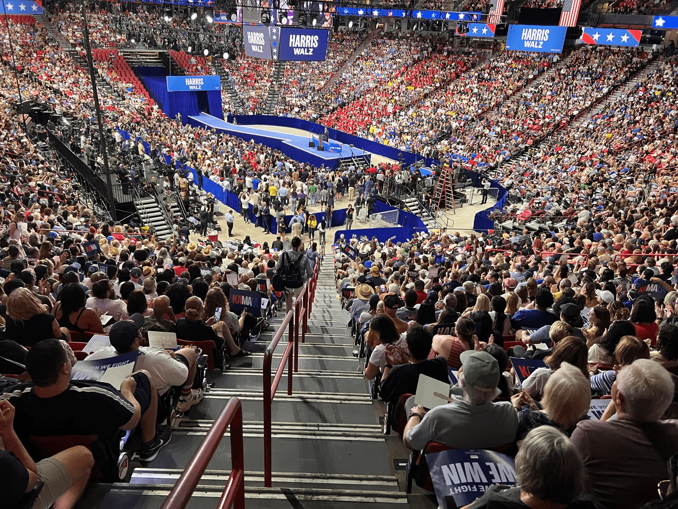 最近,贺锦丽-沃尔兹的集会吸引了大量支持者参加。根据竞选团队的统计,有1.2万人参加了费城和威斯康辛州奥克莱尔的集会。在底特律地区和亚利桑那州的格伦代尔,这个数字是1.5万。上周六,拉斯维加斯一所大学的体育馆内聚集了1.5万多人(贺锦丽竞选团队估计观众为1.2万人,但当地媒体经过反复计算,将人数调整为1.5万),顶着109华氏底的高温排队进场,最后有4000人未能进场——作为对比,6月份有6900人来维加斯参加了川普的户外集会。