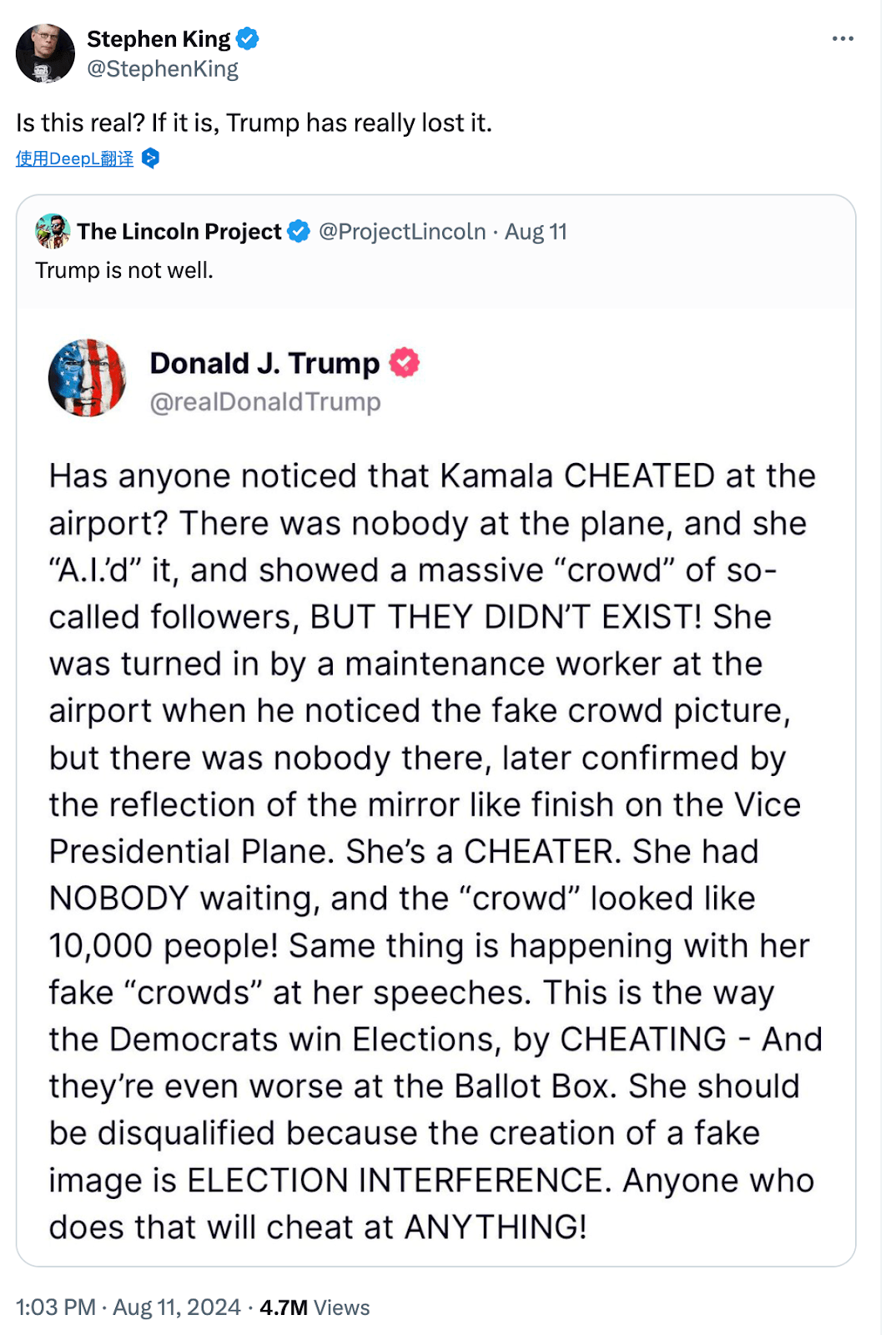 周日他在Truth Social上的一篇帖子中写道:“有人注意到卡玛拉在机场作弊了吗?飞机上没有人,她是人工智能生成,并显示了一大群所谓的追随者,但他们不存在!”恐怖小说作家史蒂夫·金转发了川普的这段言论,问道:“这是真的吗?如果是真的,川普真的抓狂了。”有评论说:“是真的,所以比你写的小说还要吓人呢。”