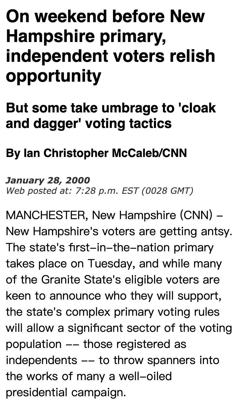 事实: 川普的说法充其量只是误导。在新罕布什尔州的共和党初选中,登记为民主党人的人不能投票。只有已登记的共和党人和无党派人士(登记为 “未声明”的人)才能在初选中投票。虽然确实有近4000名登记为民主党人的选民在10月6日之前将其党派转为未声明党派或共和党人,但目前尚不清楚这些人中有多少人最终参加了投票。值得注意的是,苏努努在2017年成为新罕布什尔州州长,但早在他当年的十几年前,该州就已经向无党派人士开放初选。比如下图中CNN在2000年对该州无党派人士参与初选投票的报道。