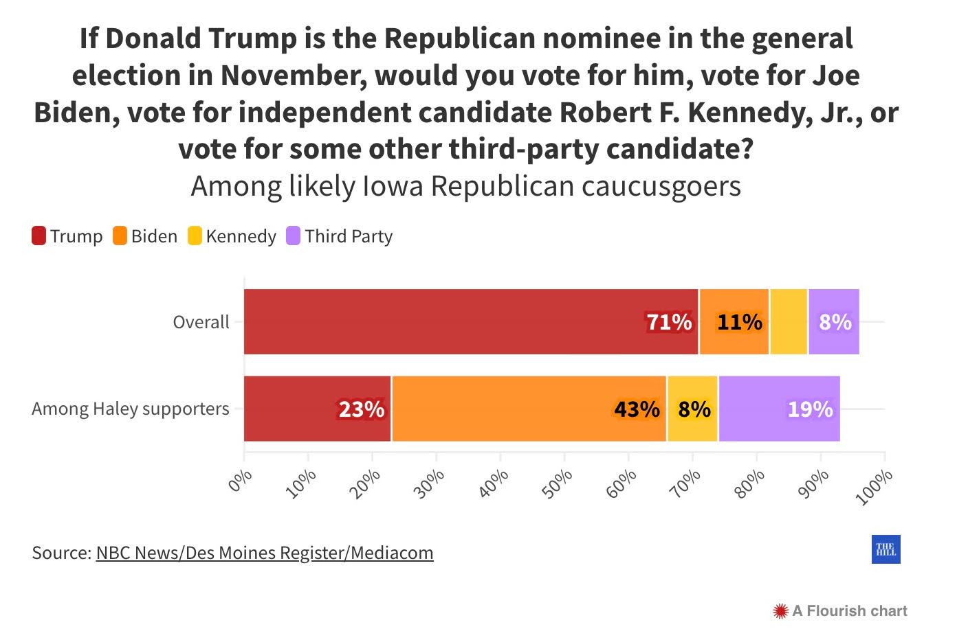 而在爱荷华党团会议前,一项新的民意调查显示,该州43%的黑利支持者表示,如果川普成为共和党提名人,他们会投票给拜登,而只有23%的人表示他们会投川普。