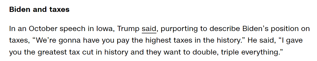 CNN此前曾对川普的类似说法进行过事实核查,即川普所说的“他们想把所有东西的税收都翻一番、两番”。结果他现在的说法已经变成四倍了。