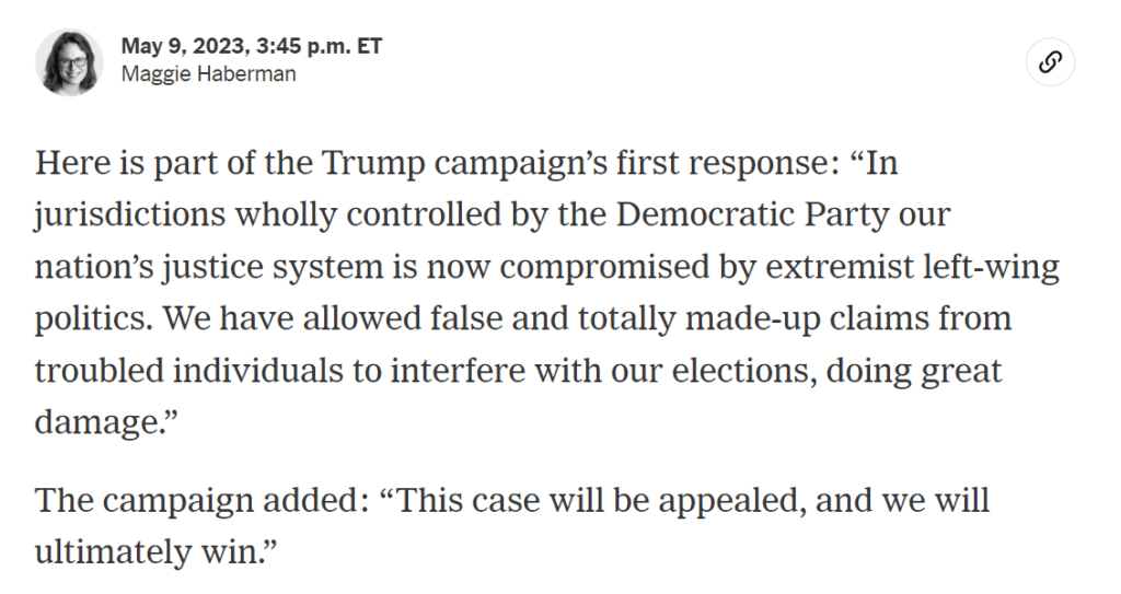 在作出裁决时,陪审员得出结论,卡罗尔并没有以优势证据证明如她长期声称的,川普强奸了她。但他们确实发现她以该标准证明了他对她进行了性虐待和伤害,因此判给她200万美元的伤害赔偿。在得出川普行为鲁莽的结论后,他们还裁定了20000美元的惩罚性赔偿。