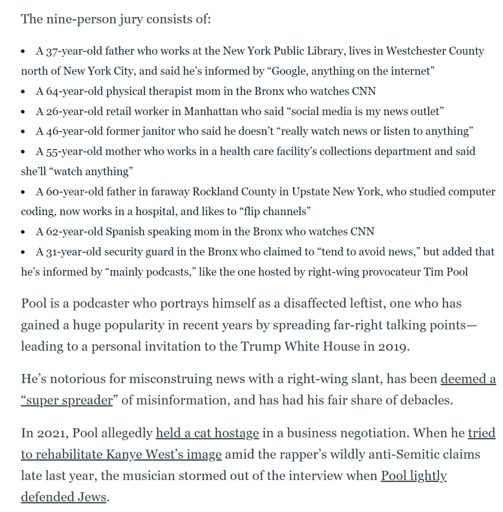 媒体披露的陪审员的身份信息,他们来自各行各业,有图书管理员,理疗师,工人,零售人员,清洁工,医疗机构工作人员,医院护工,家庭主妇等。他们的消息来源,有看Google,或者网上搜新闻的,有看CNN的,也有听鼓吹右翼阴谋论的播客的年轻人。